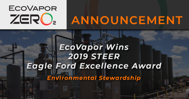 EcoVapor Recovery Systems wins Environmental Stewardship award ZerO2 units help mitigate flaring and fugitive emissions of methane and VOCs from surface storage tanks DENVER, CO (November 20, 2019) – EcoVapor Recovery Systems LLC today announced that the South Texas Energy and Economic Roundtable (STEER) selected EcoVapor as a winner for Environmental Stewardship in their 2019…